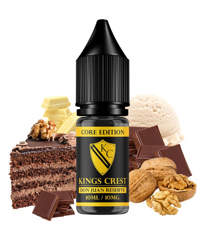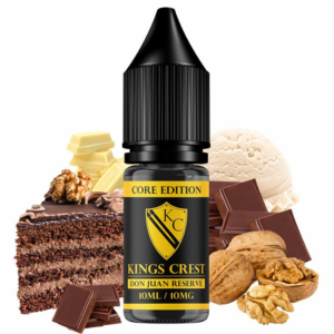 El líquido Don Juan Reserve de Kings Crest Core Edition Salts sorprende por su sabor a tarta de chocolate recubierta con mantequilla de nueces pecán y crema batida. ¡Ideal para vapear diariamente!